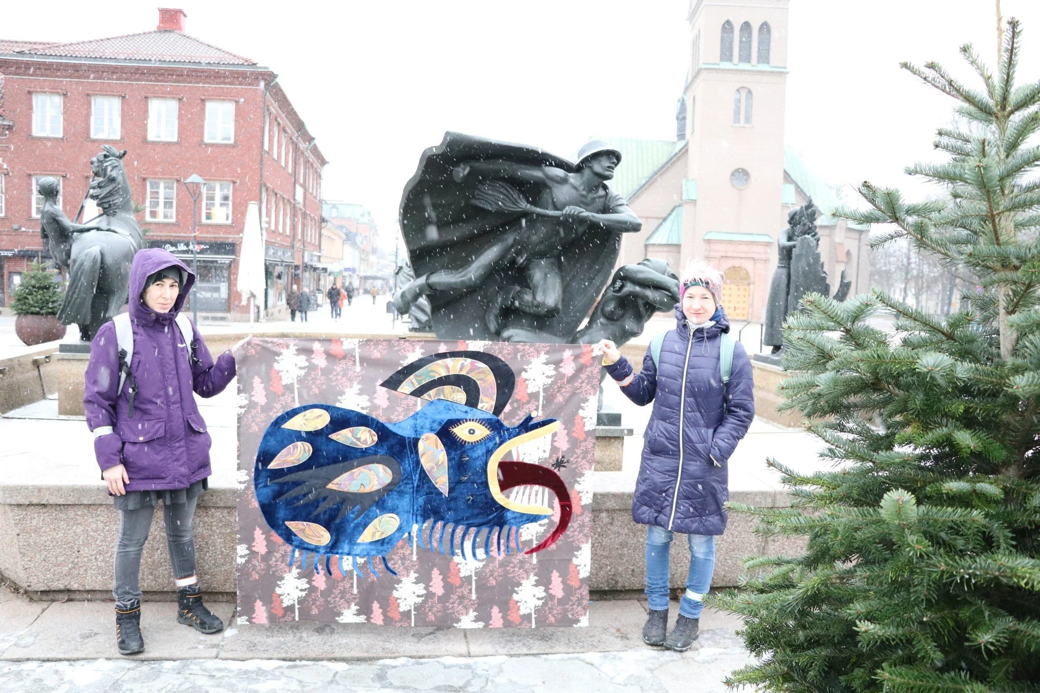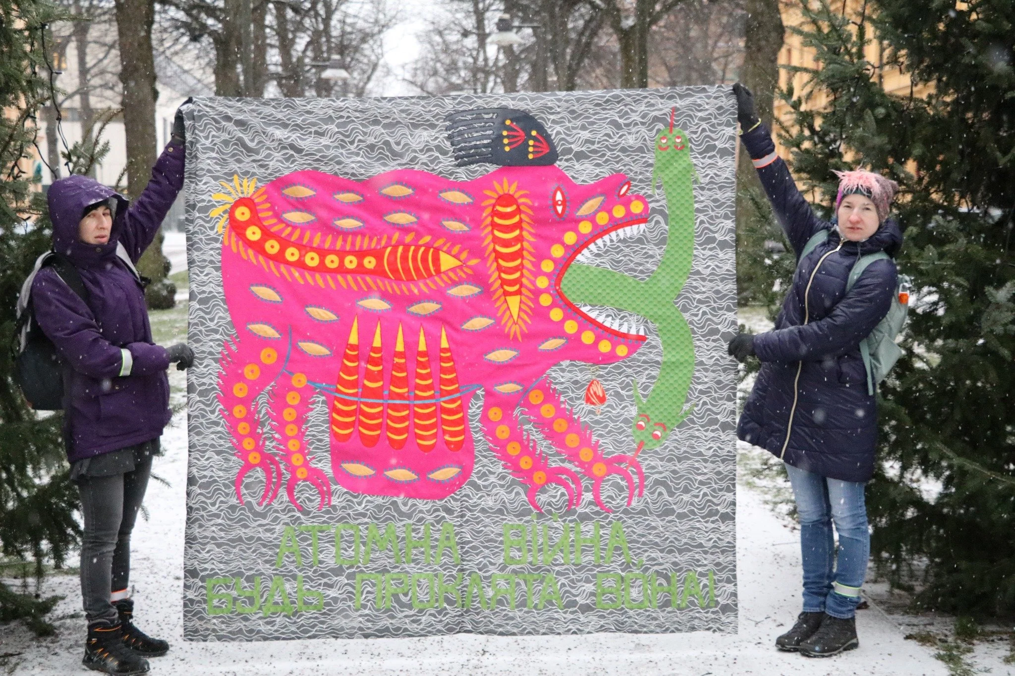Photo 1 – Textile anti-war banner inspired by Maria Prymachenko’s “May That Nuclear War Be Cursed!” (1978). Created by artists Ton Melnyk and Masha Ravlyk of the Ukrainian feminist collective ReSew (2022). Photo courtesy: Ton Melnyk and Masha Ravlyk (rights owned by the artists).
